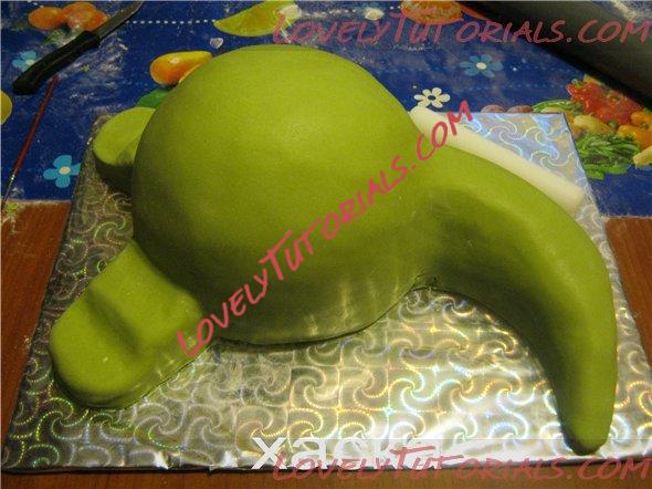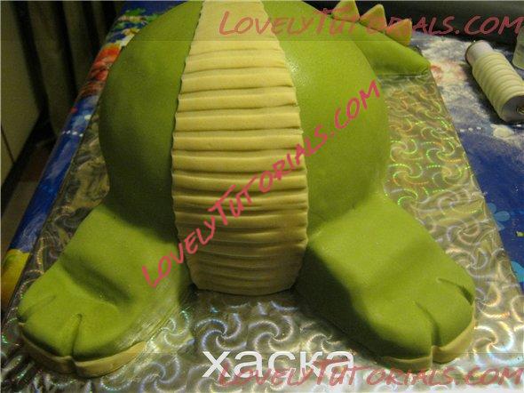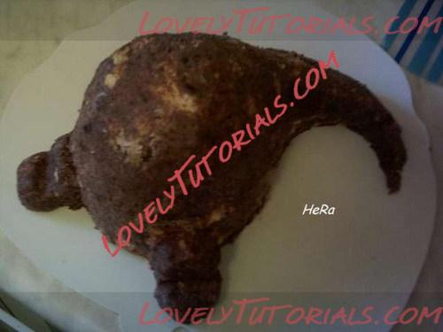 Хочу обратить ваше внимание, что торт сложной составной формы, поэтому собирался он на подложке, на которой отдавался. Для того чтобы ее не испачкать использовала пергамент. Сделав в области хвоста надрез и вырезав дырку по форме туловища динозавра. Затем, когда динозавр был обмазан и собран, не составило большого труда извлечь эту бумагу.