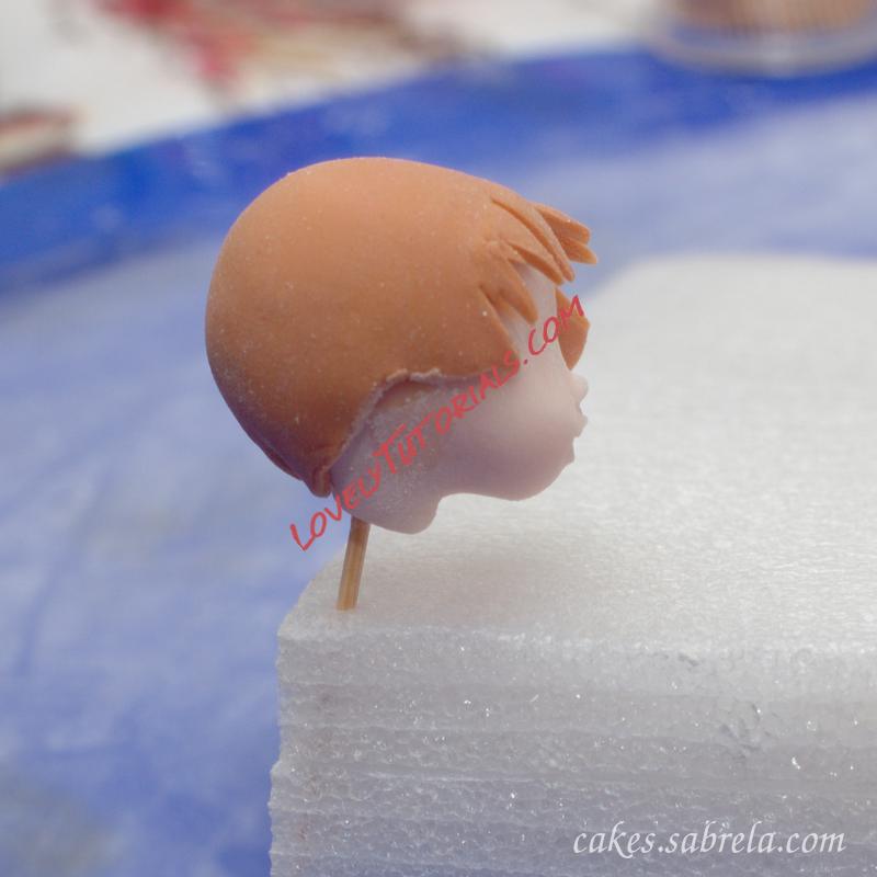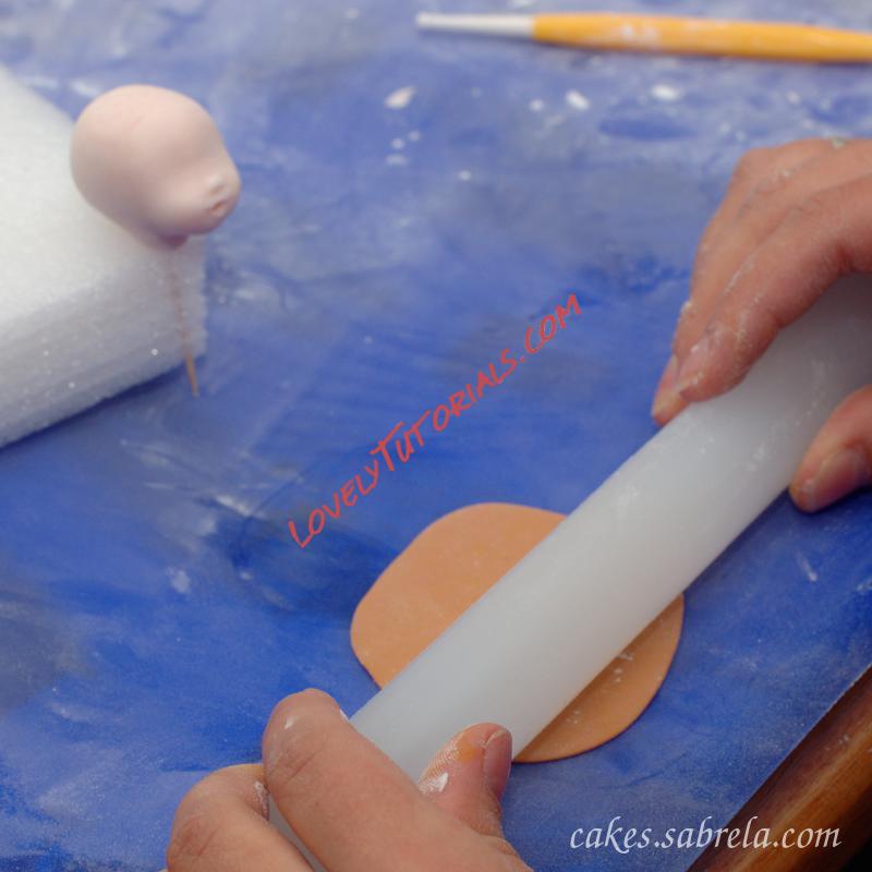 2. Прическа.раскатываем тонко кусочек мастики нужного вам цвета. У меня девочка русая, поэтому цвет светло коричневый.