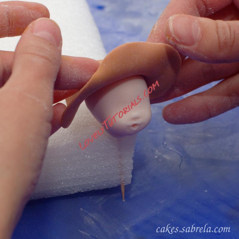 Смазываем головку водичкой или специальным сахарным клеем. Надеваем пласт мастики на головку как шляпку и разглаживаем, как будто обтягиваем торт.