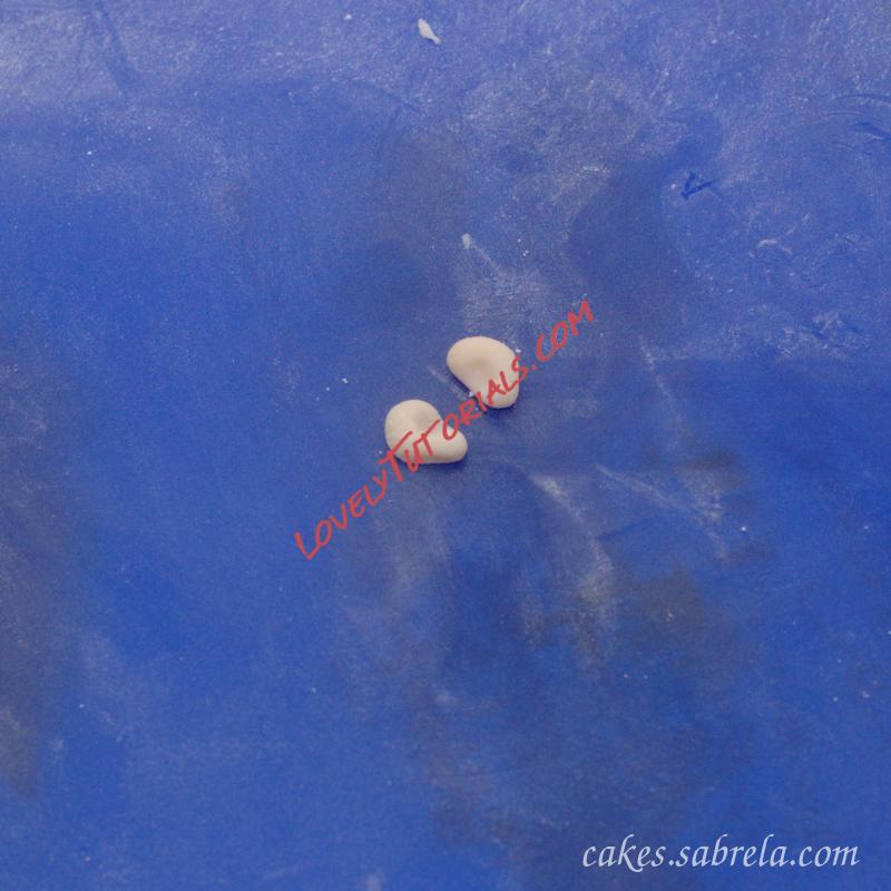 3. Ушки.. Скатываем два маленьких шарика, уплощаем их,делаем маленькую вмятинку в середине. Приклеиваем на воду или клей к головке.