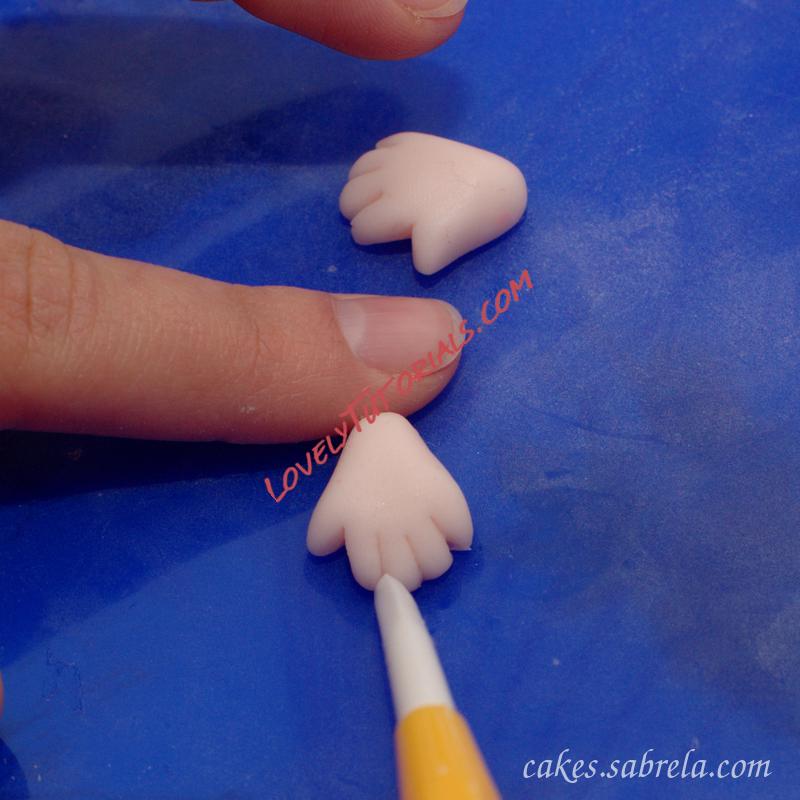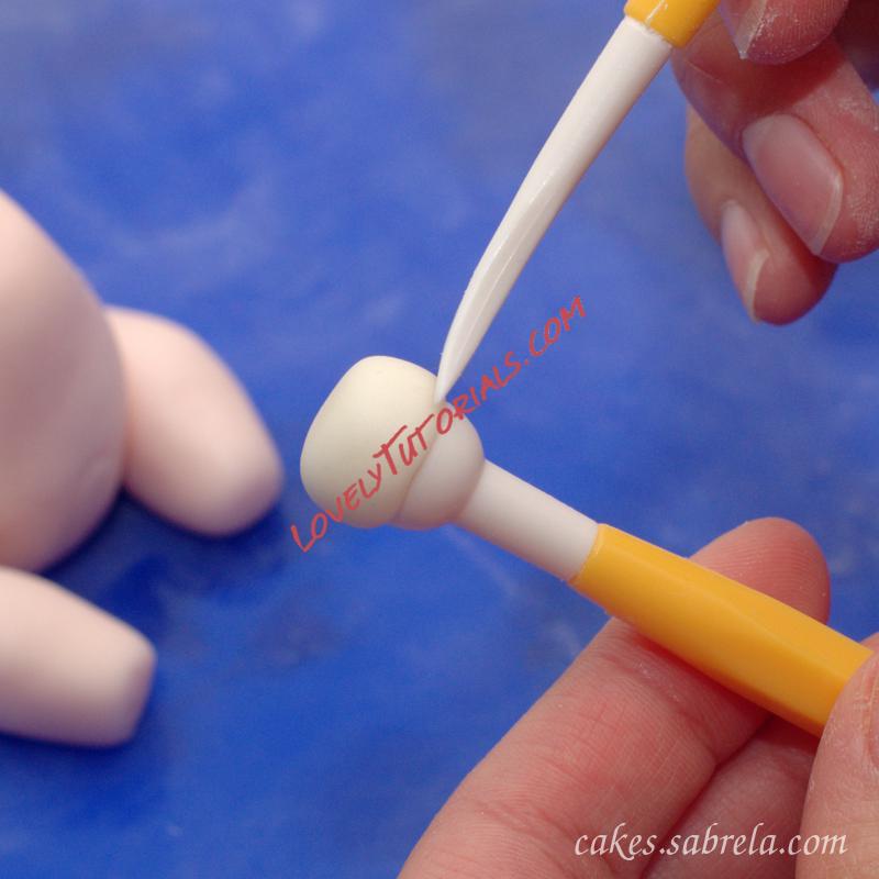 6. Носочки.. Формируем носочки из белой мастики на инструменте с шариком. Смазываем углубление клеем и насаживаем на заготовку ножек.