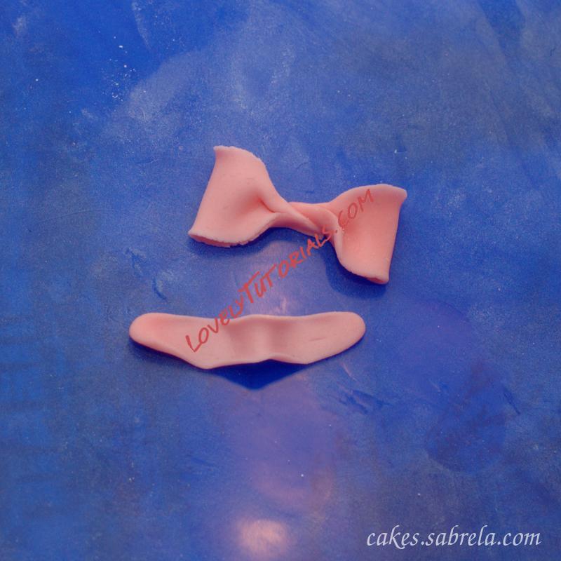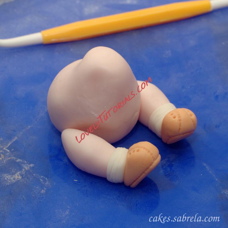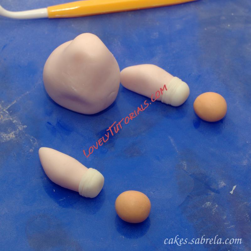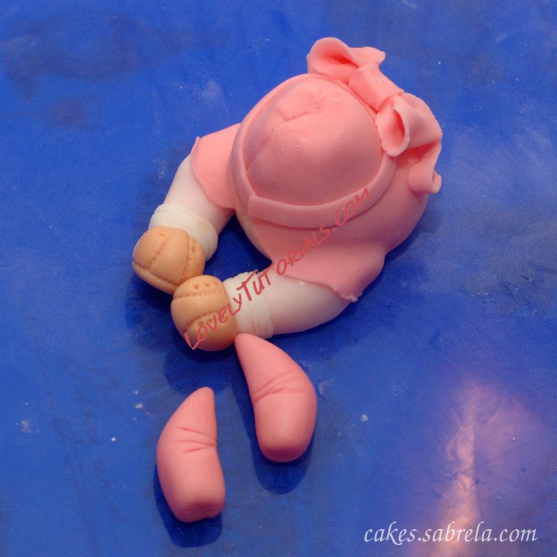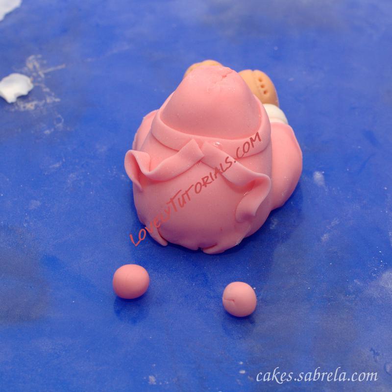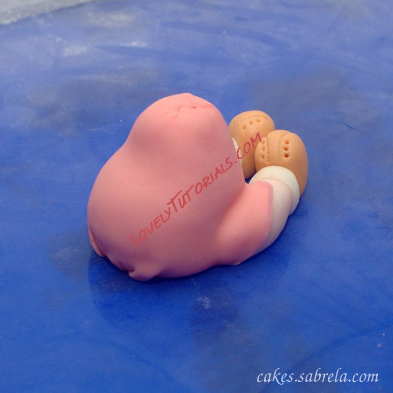 5. Тельце и ножки.. Скатываем шарик из нежно-розовой мастики, вытягиваем его, делаем углубление в местах прикрепления ручек и ножек. Скатываем колбаски ножек, слегка сгибаем их.