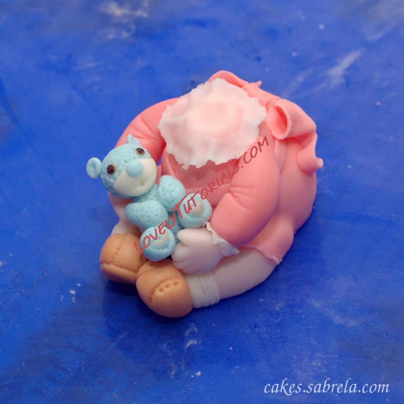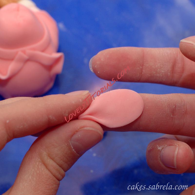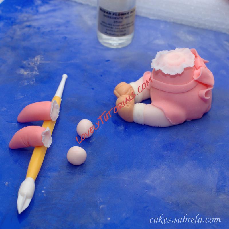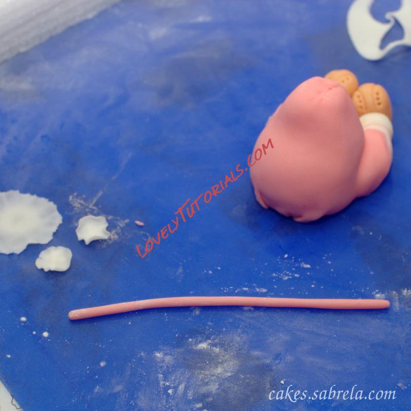 3. Ручки. Из розовой мастики скатываем колбаски-ручки. Делаем складочки в районе сгиба руки.
