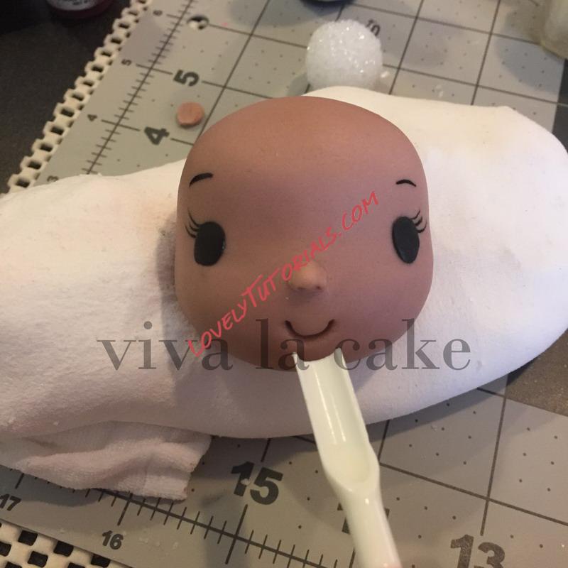 For this topper I wanted a more cuter, sweeter look. You can achieve a different look just by the position of the eyes. Positioning the eyes so far apart, give the look of a more angelical look, too close together eyes give a more goofy look. (looks like that is a good topic to discuss on another tutorial). I am marking the eyes just for you to see it as a reference, you really don't need to do that, unless you feel more comfortable. Two little pieces of fondant to form the eyes, again more oval shape than rounded. Paint the eye lashes using a extra fine brush I use 000 or 5/0