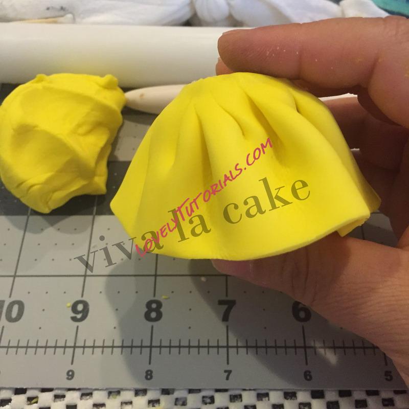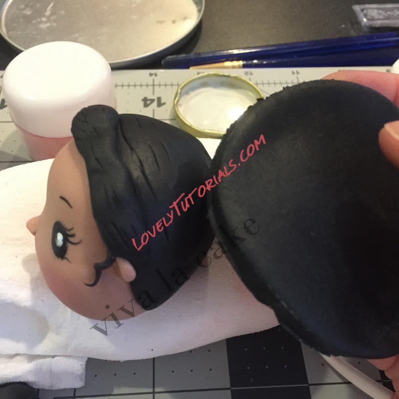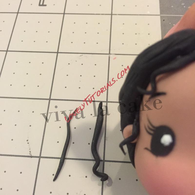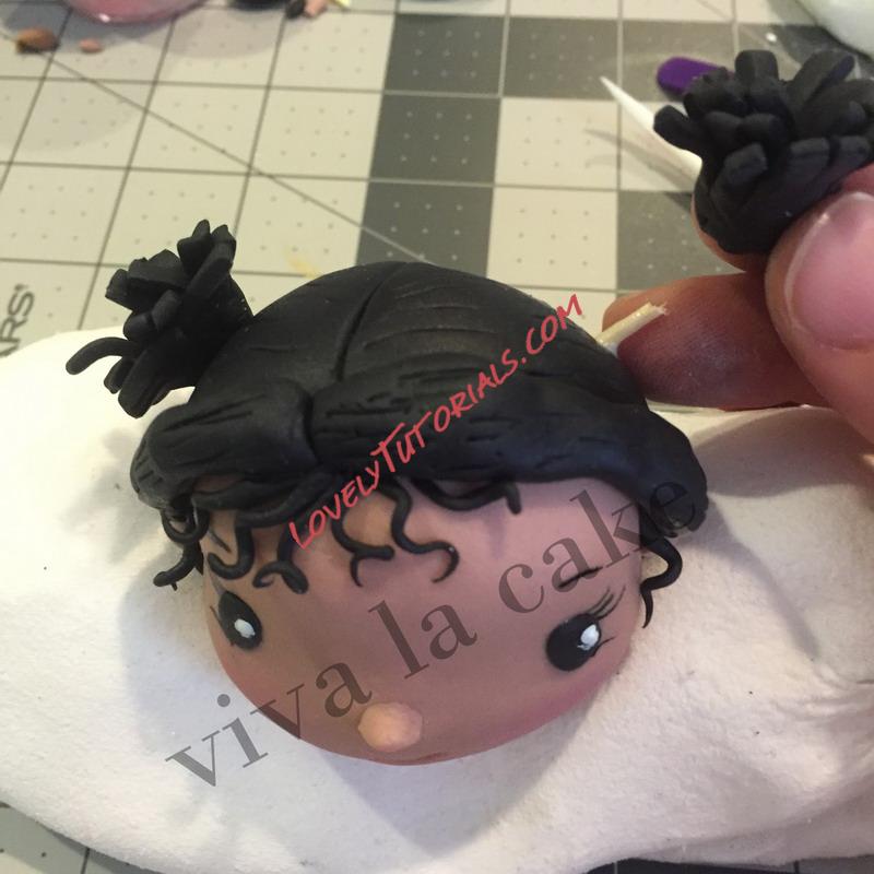 She is meant to have curly hair, so I rolled a piece of fondant, and pressed it in different parts so it can look waved. Roll some tiny pieces of fondant to make some cute curls to place around her face.