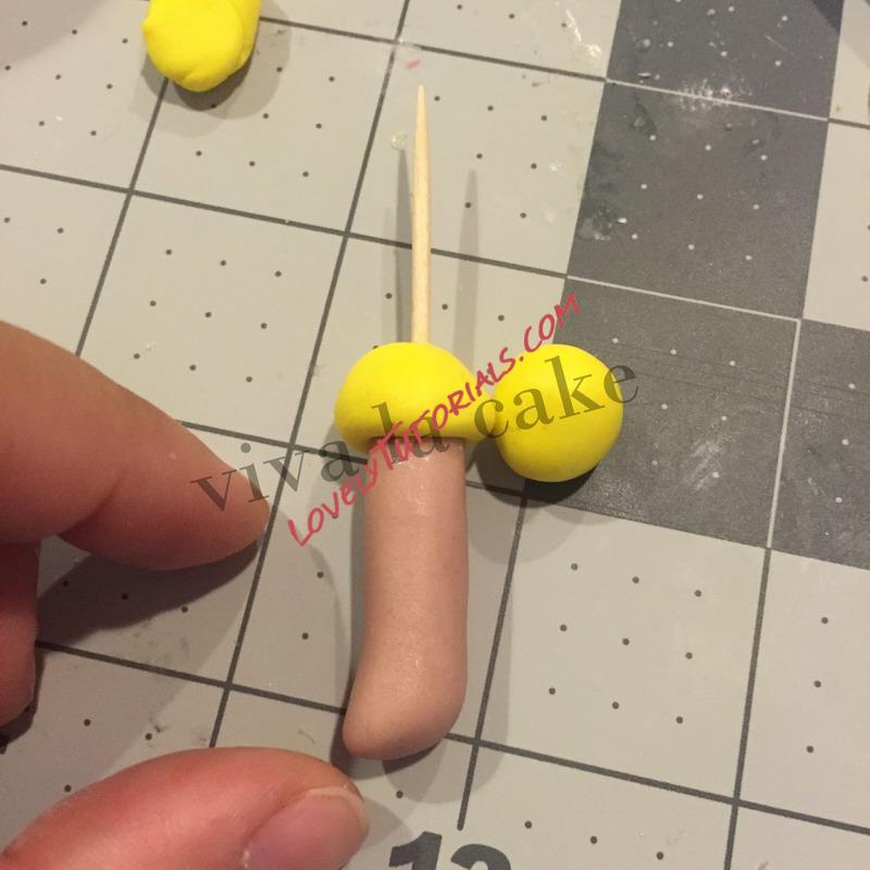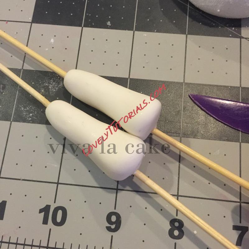 Time for the legs, roll two pieces of fondant, these are about 25 grms each, add some wooden dowels, make sure to leave enough to be inserted inside the cake, Set apart and let dry for a while.