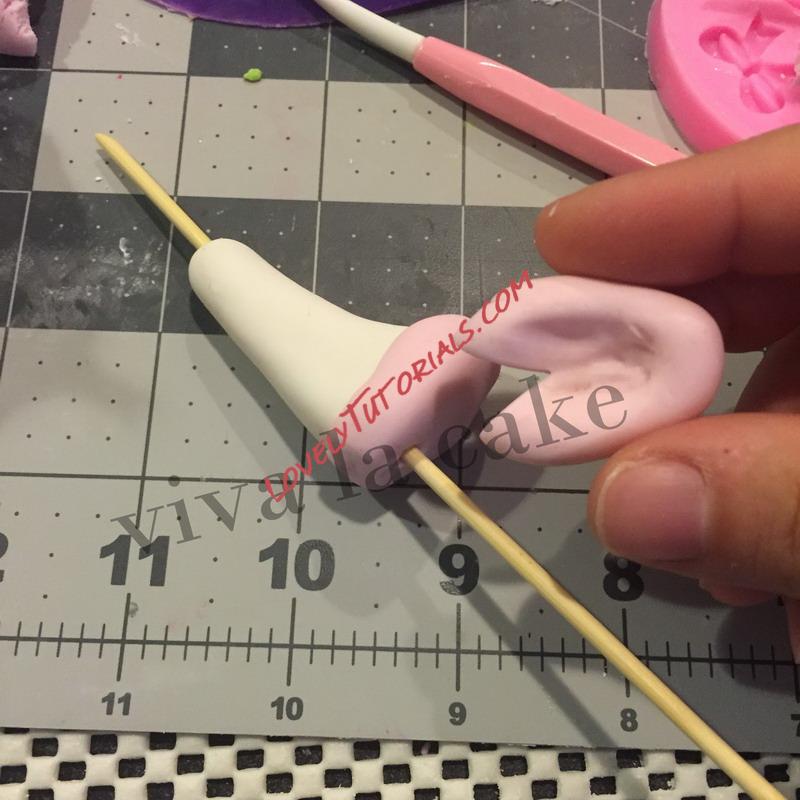 Put some color on her cheeks, white dots to bring some light to her eyes and cover her head with a piece of fondant, add the ears which should be one bit down from eye level