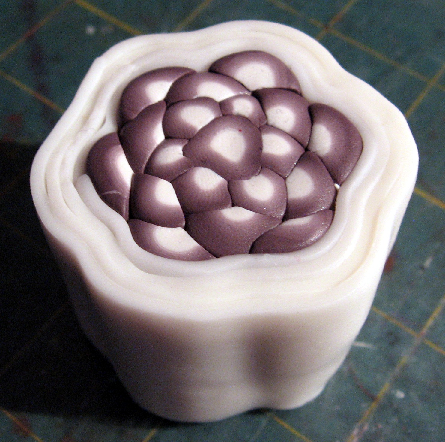Purple Flower Cane (I really couldn't think of a more creative name for this one, sorry.) Materials: equal amounts purple and white clay translucent clay for background