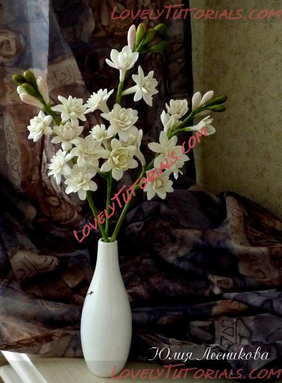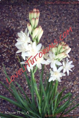 Вообще-то стебель настоящей туберозы достигает и до 30 см, а цветки в диаметре 5-6 см, длиной 3-4 см. Количество цветов на ветке 20-30 шт….Расположены в основном попарно. У меня все это чуть уменьшено, и количество цветов сокращено почти втрое))) Листья ярко-зелёные злаковидные шириной 1,5 см и длиной до полуметра, чем то напоминают листья нарцисса. (Я делала без них) /фото с инета/