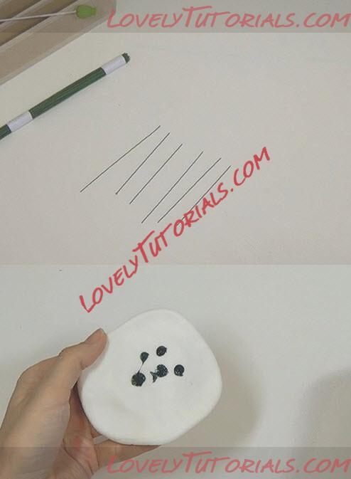 Раздвигаем концы капли и подправляем их пальцами, убирая место среза, и собираем концы в кучку. После петельку на проволоке окунаем в клей, обмазываем излишки о края баночки и с толстой стороны одеваем серединку на проволоку. Все хорошо снизу подправляем и закрываем края проволоки полимерной глиной. Возьмем роликовый нож и аккуратно, начиная с кончиков, сделаем продольные надрезы до основания серединки. Итак, мы сделали серединку и визуально разделили ее на пять прожилок. Отправляем ее на сушку сушиться.