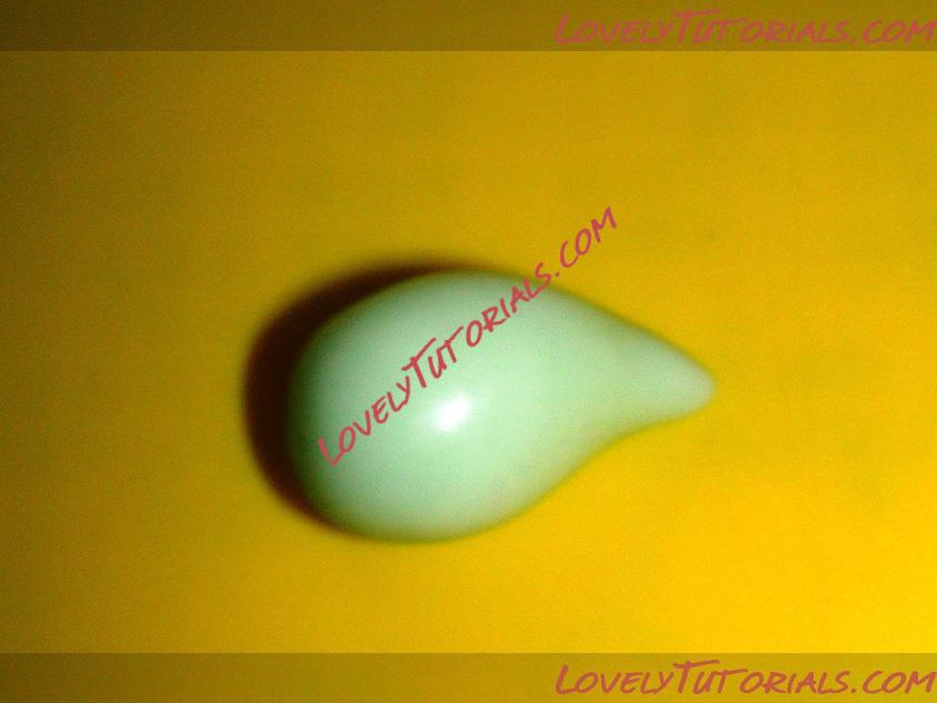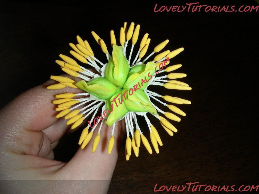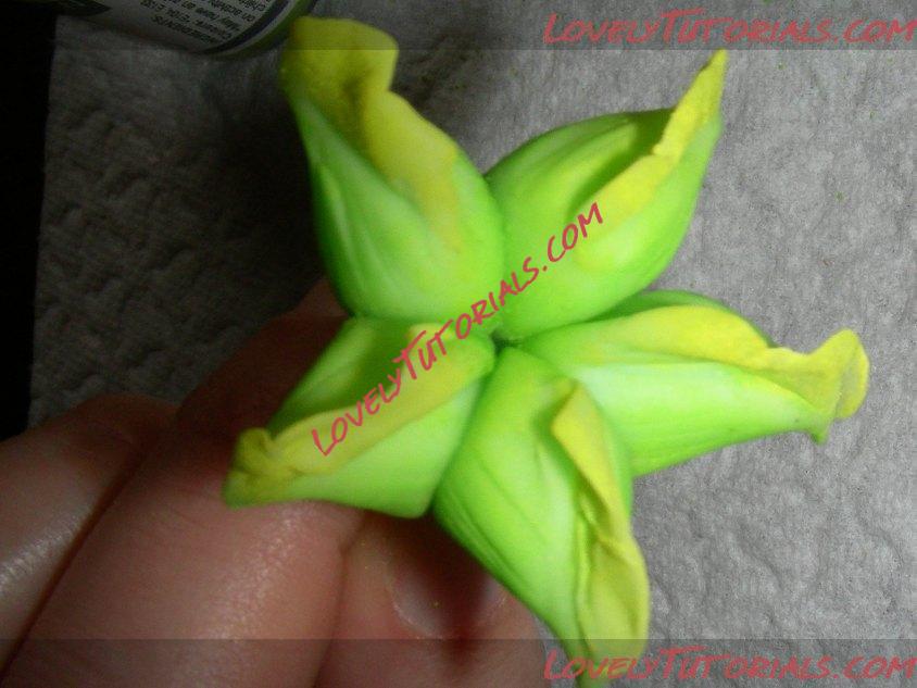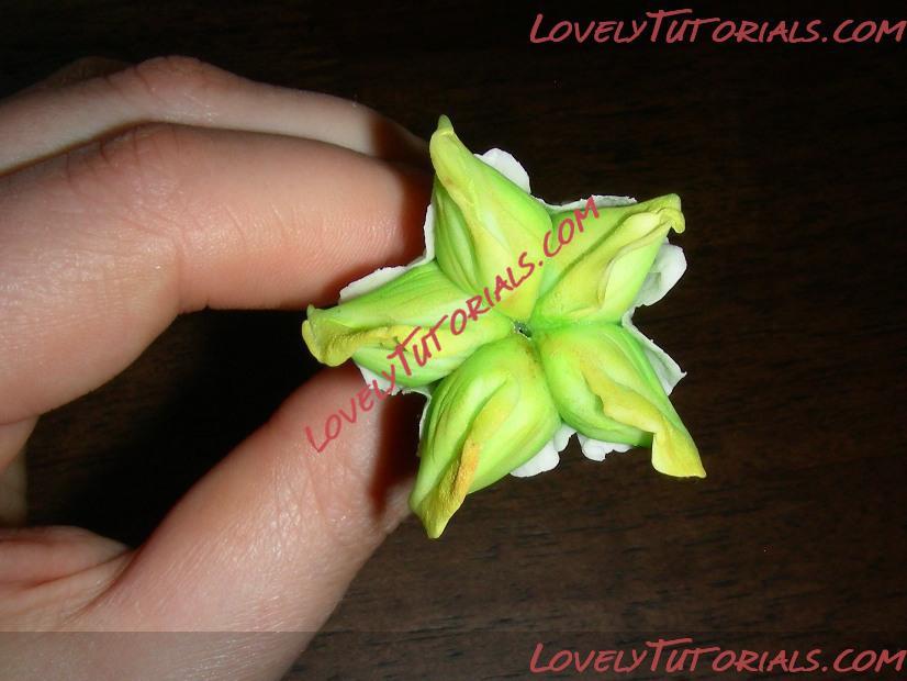 Für die Blütenmitte werden 5 Tropfen mit etwa 2cm Länge geformt aus blassgrüner Blütenpaste benötigt. Die Tropfen werden leicht hakenförmig gebogen. Die Oberfläche mehrfach einritzten. Dann wird die Außenkurve mit einem Stäbchen ausgedünnt, bis die Kante fast durchscheinend wirkt und deutlich ausgefranzt ist.