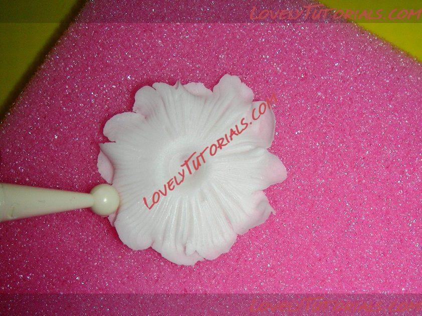 Für die inneren Blütenblätter weiße Blütenpaste auf dem Cell-Board ausrollen. Dann mittelgroße Herzen (6cm) ausstechen, so dass die entstandene Wulst unten in der Mitte des Herzens ist. Einen 24g Draht mit Zuckerkleber befeuchten und vorsichtig in die Wulst schieben.