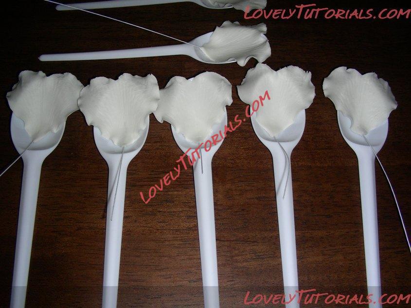 Auf diese Weise 5 mittelgroße Blütenblätter herstellen. Die Blütenblätter dann so in Plastik-Esslöffeln trocknen, dass sich die Ränder nach außen wölben. Achtung, den Draht dabei nicht aus der Blütenpaste brechen!