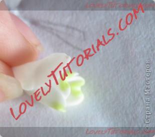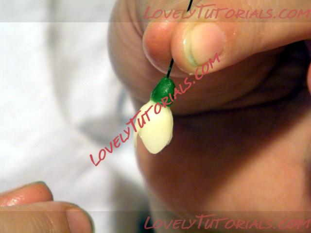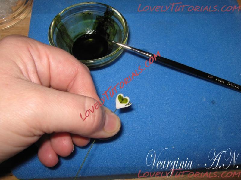 Далее переходи к созданию лепесточков подснежника,у подснежника два ряда лепесточков маленькие и большие.Начнем мы с создания маленьких лепесточков,для этого мы возьмем полимерную глину смешанную с белилами и сделаем три маленьких шарика.Делаем из шарика капельку и слегка приплюснем ее,при помощи стека мы разгладим будущий лепесток и на верхней части,при помощи стека сделаем форму напоминающею сердечко.Проделываем то же самое с двумя нашими заготовками,затем берем проволоку и приклеиваем лепестки к середине,середину предварительно смажем латексным клейм. После приклеивании всех лепестков,собираем лепестки вместе,дальше мы берем кисть и зеленую масляную краску и рисуем "сердечко"на внутренних и внешних краях всех лепестков.