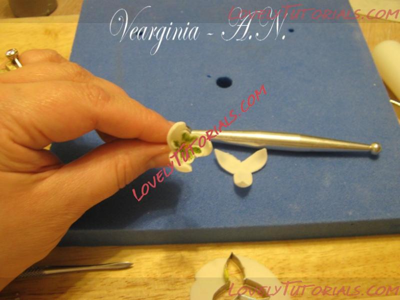 Не трогая ножку лепестка,при помощи стека раскатаем верхнею часть в округлую вытянутую форму,в этом процессе главное не допустить,что бы лепесток получился слишком широкий.Он должен быть овальный и узкой формы.Дальше нам надо придать внутренний изгиб лепестка,для этого мы берем стек с шариками и в середине лепестка по всей длине добиваемся этого изгиба.Таким же способом делаем остальные лепестки,при этом постарайтесь максимально сделать их одинаковыми.