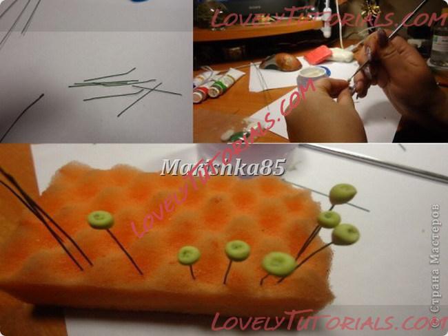 формируем маленькие шарик(около 3-4мм) одеваем его на проволку(предварительно макнув ее в клей пва), снизу прижимаем, формируем что-то вроде приплюснутой капли, сверху шарик тыркаем стеком( либо зубочисткой). Отправляем сушится, нам понадобится от 5 до 9 тычинок.( Сколько вам не лень сделать)