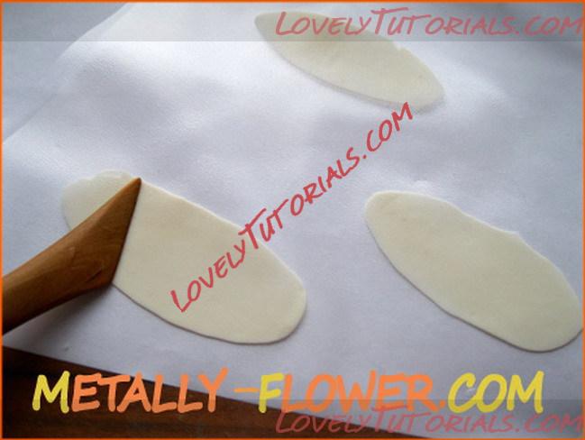 5. Теперь лилии. Сахарную пасту лучше делать с трагакантом, масса получается очень пластичной, можно раскатать очень тонко и быстро сохнет, что уменьшает время ожидания. Но если его нет, то цветы все равно получаться, можно при замесе пасты заменить 100 грамм пудры, на 100 грамм кукурузного крахмала, лепестки тоже будут сохнуть быстрее.