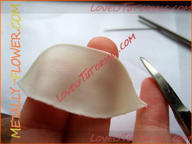 Шаг 6. Вырезаем каттером лепесток. Здесь очень важно, чтобы все они были одинаковой формы – у лилии симметрия очень заметна. А каттер сделать легко из жестяной банки или даже пластиковой бутылки, т.к. форма лепестка тривиальная, никаких сложных изгибов в ней нет.