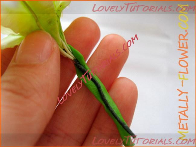Шаг 26. Обкатываем стебель зеленым ХФ, слегка захватывая проволочные каркасы лепестков. Если они слишком длинные – обрезаем, сколько нужно.