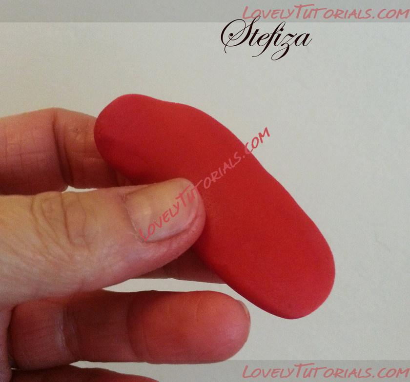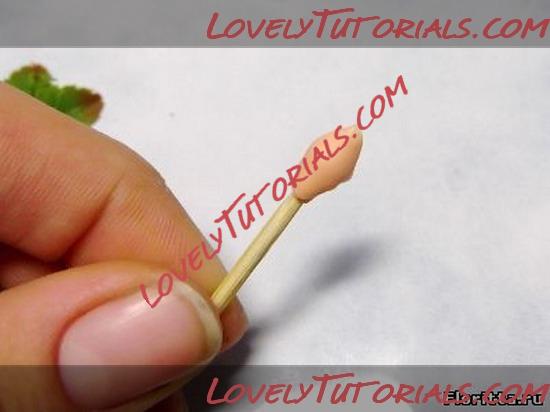 1. Кусочек флористической глины смешайте с небольшим количеством белой краски, затем добавьте совсем немножко красной и желтой краски. Добавляйте краску кончиком зубочистки, чтобы не переборщить. Тщательно перемешайте глину. Должен получиться персиковый цвет. Теперь маленький кусочек персиковой глины наденьте на кончик зубочистки и придайте ему форму овального бутончика с заостренной верхушкой. Высота бутончика должна составлять около 0,7см.