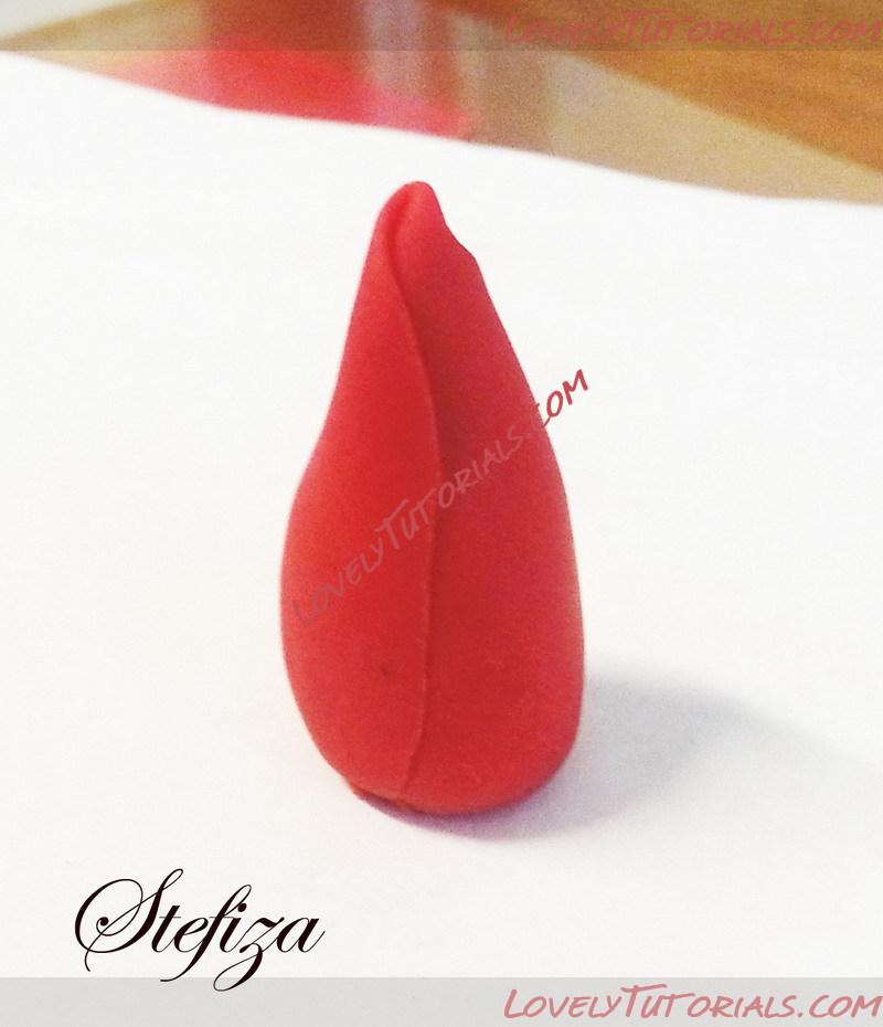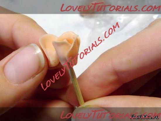 2. Слепите из персиковой глины несколько маленьких лепестков, намажьте их основание клеем и приклейте к бутону.