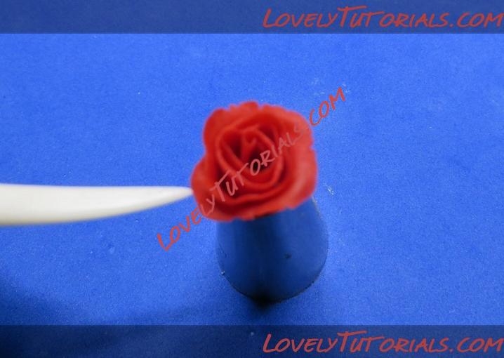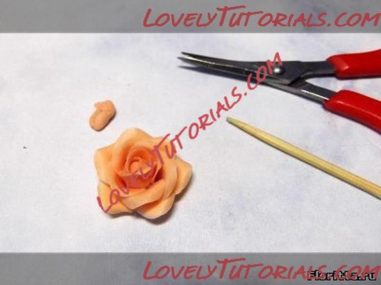 4. Снимите розу с зубочистки, стараясь не нажимать на лепестки. При необходимости обрежьте маленькими ножницами излишки глины снизу розы.