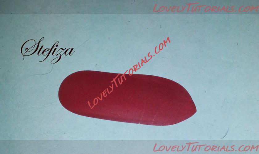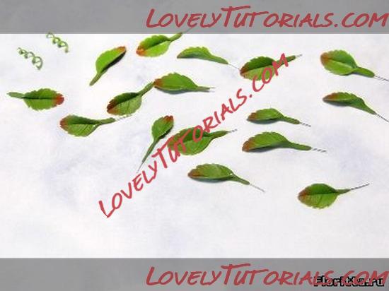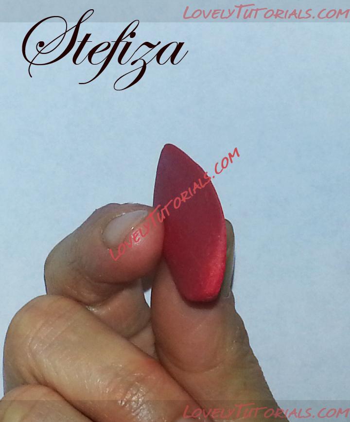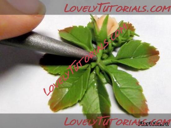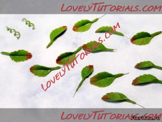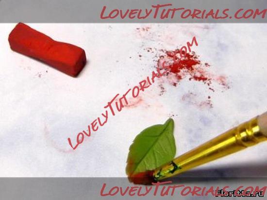 8. Кончик листа нужно тонировать красно-коричневой пастелью при помощи упругой кисточки. На некоторых флористических глинах пастель не очень надежно держится, поэтому затвердевшее изделие нужно покрыть специальным лаком для таких глин, либо не тонировать лепестки на этом этапе пастелью, а тонировать их масляной или акриловой краской, когда листики уже будут высохшими.