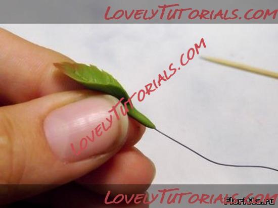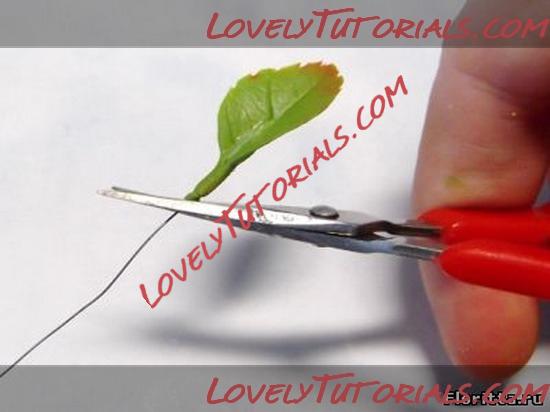 10. Несильно придавите проволоку к листику, затем защипите листик с обратно стороны так, чтобы проволока стала невидна. Черешок листика покатайте между пальцами, чтобы проволока оказалась внутри него.
