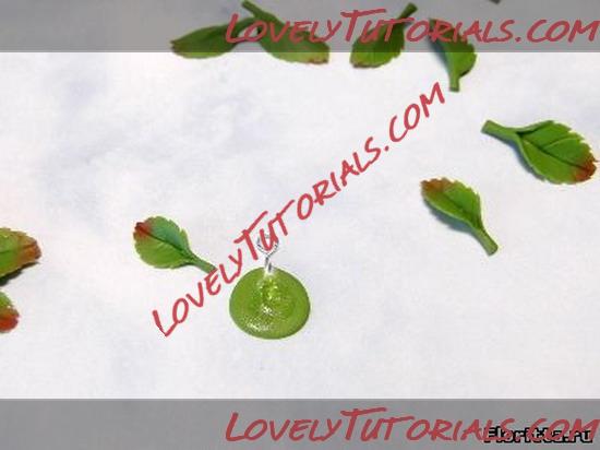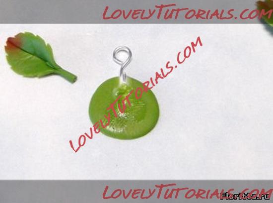 14. Из зеленой глины сформируйте плоский круг толщиной 0,1см и диаметром 1,5см или немного больше. Затем возьмите короткую булавку для бижутерии, загните ее конец плоскогубцами и приложите к зеленому кругу так, чтобы петелька булавки находилась на краю круга. Нижнюю (загнутую) сторону петельки вдавите в круг.