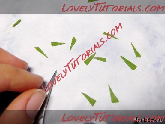 16. Тонко раскатайте полоску зеленой глины шириной 1см и разрежьте ее ножом на узкие треугольники.