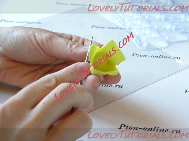 Вынимаем лепесток из вайнера кладем лепесток на мат немного и проходимся по самому краю контуров лепестка шариком, что бы они были не грубыми отрезанными краями, а выглядели более естественно. Нам нужно не сделать край волнистым, а более тонким. Инструмент нужно держать в руке, как ручку или карандаш и проводить им по самому краю лепестка, т.е. половина шарика ведется по лепестку, а другая половина шарика скользит по мату. Лучше это сделать не сразу, а вернуться к 1-му лепестку после того, как вырежете 2-й, что б дать слегка (не сильно!) лепестку подсохнуть, т.к. по чуть подсохшему лепестку будет легче пройтись шариком, что б мастика не липла к инструменту.