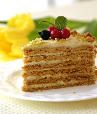 Этот торт достаточно мягкий, но менее влажный, чем торты со сметанным кремом и более сладкий из-за сгущённого молока - как раз таким он мне и нравится, особенно с кремом из варёной сгущёнки.