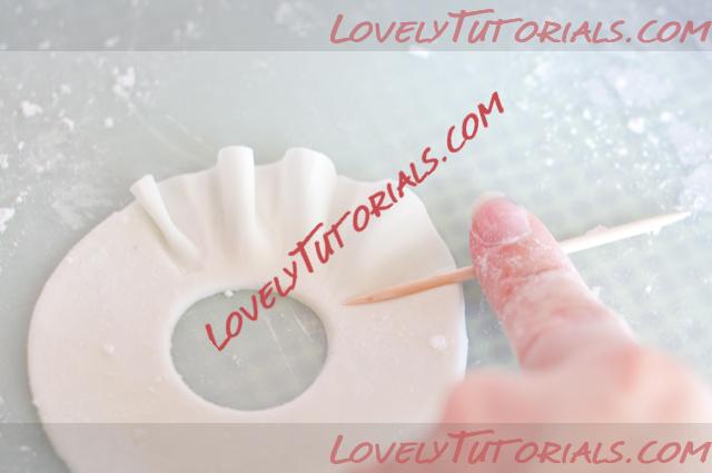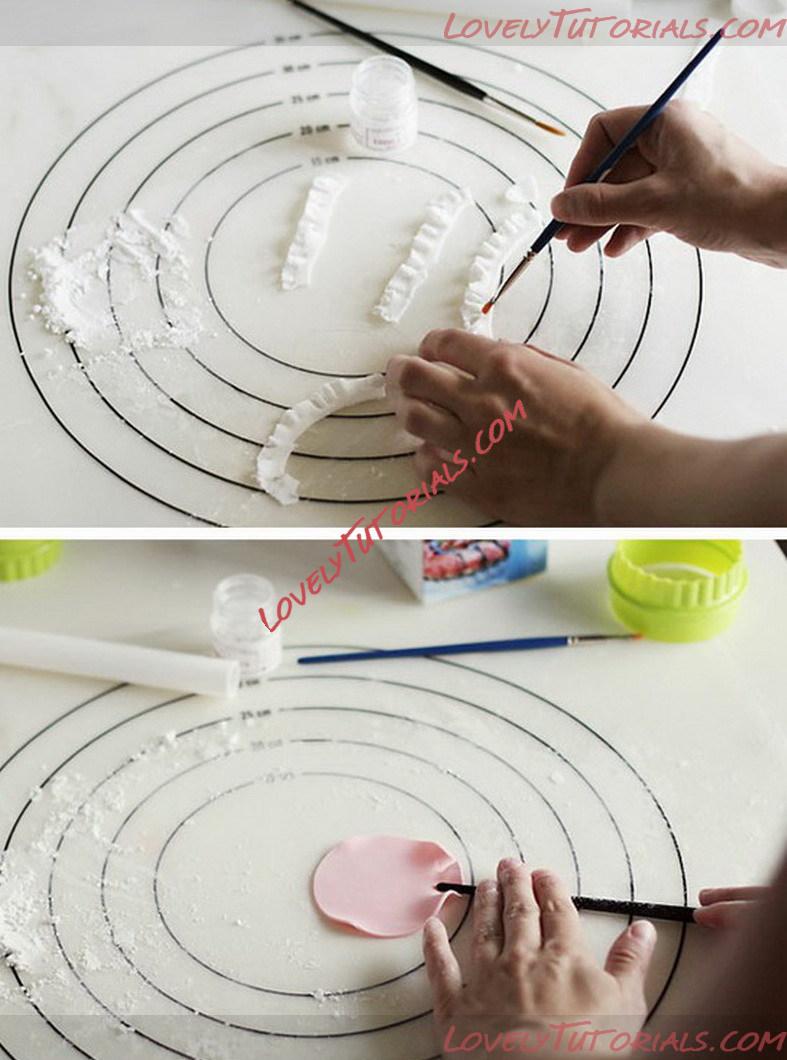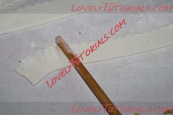 To frill the strips, I used corn starch on the counter and rolled the zigzag edges with a rounded dowel. Don't press on the straight edge since you want the strip to be frilled.