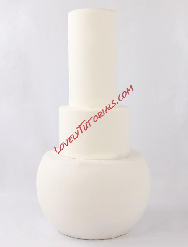 Using a shark knife, carve the bottom tier by rounding off the corners to create a pillow shape. Cover all the tiers with with fondant.