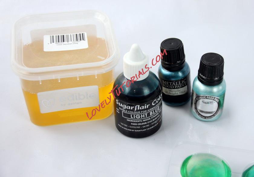 Heat up the edible gel for 20 seconds in the microwave - pour what you need into a cup and mix with a few drops of liquid blue color. Stir until combined to create a translucent blue.