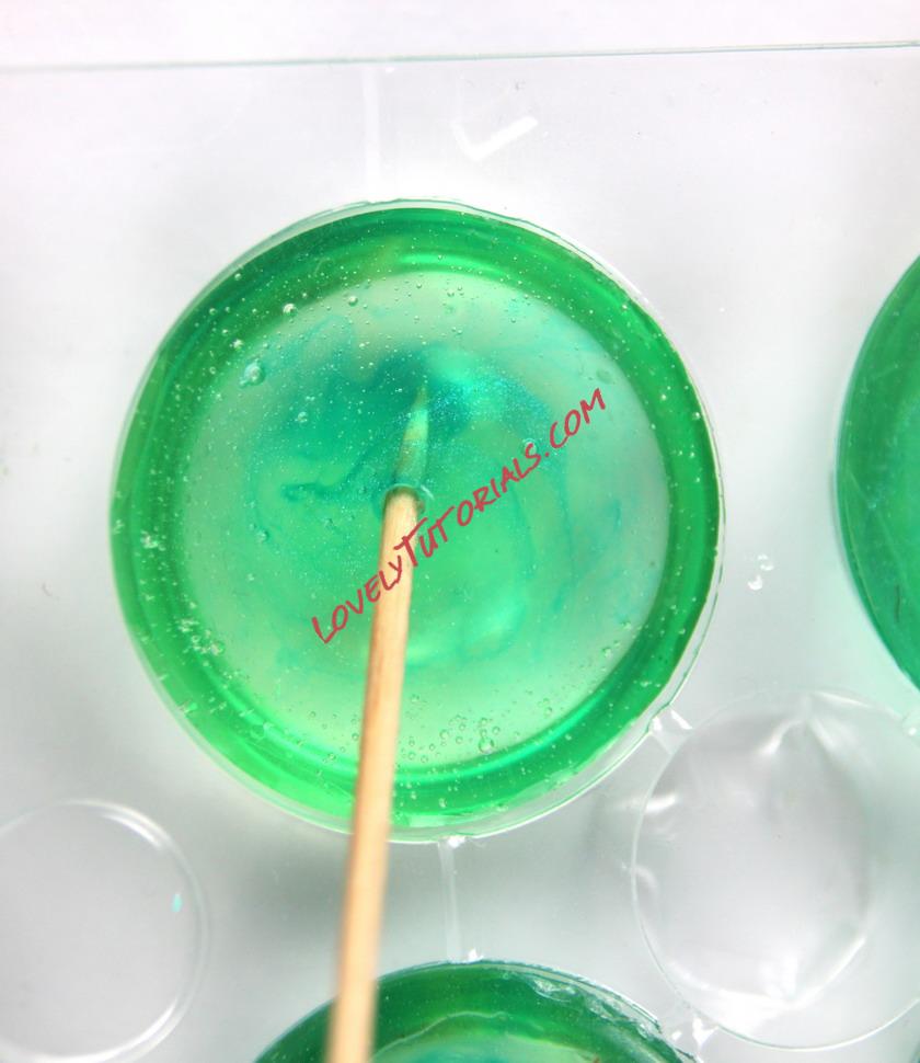 Pour the blue colored edible gel into chocolate molds. Add a few more drops of undiluted color and using a toothpick, barely swirl the color into the gel to create a marbled effect. Let sit for a few minutes.