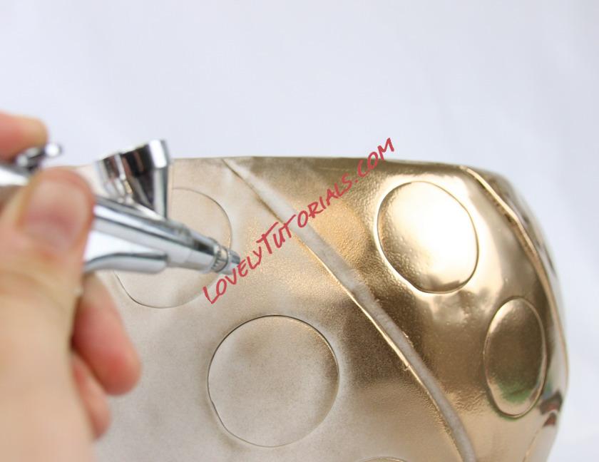 Mix the rejuvenator and edible gold pigment together to create a paint (you can also use Everclear or clear lemon extract). Paint the bottom tier with an airbrush.