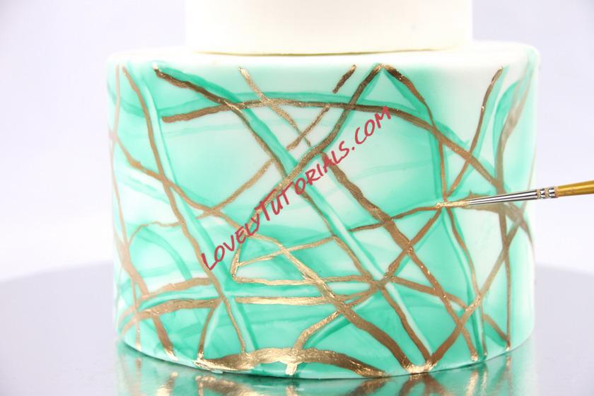 Using a clean paintbrush, paint some lines onto the middle tier using an aqua-colored gel paint. Allow to dry before adding some edible gold paint. Make as many lines as you like and allow the paint to dry and set.