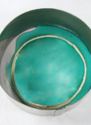 Pour some colored gelatin over the wired circle and allow to dry. Once dry, trim away the overhang to leave a clean edge.