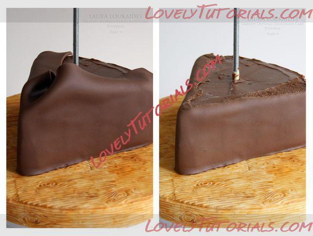 Next, roll out an uneven sausage and apply it to the sides of the cake. Using a cocktail stick make small waves to give the effect of ganache.