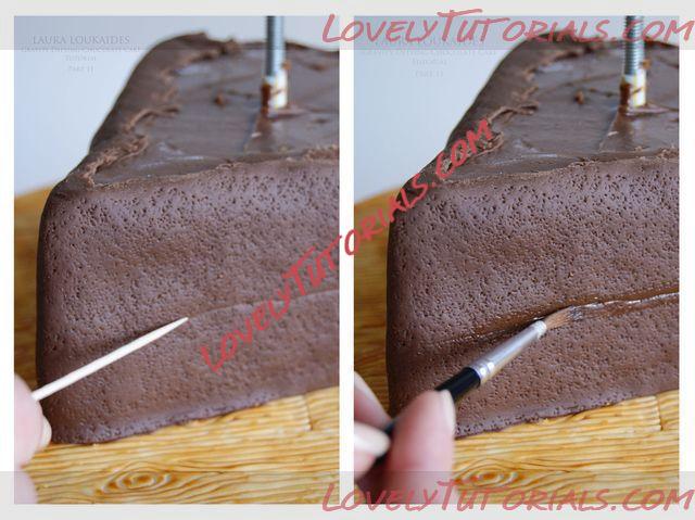 In the photo, you can see the basic support system for this cake, as I said before, this is for a small cake so larger cakes will need a stronger support. I used metal studding bent at a 90O angle. Next, you’ll need to cover the board. I used a wood grain effect as it makes the cake seem that little bit more realistic. To make the wood grain, you will need to roll out a thin piece of white fondant, then press the impression mat down firmly and pull back to reveal the effect. Cut out the individual planks and stick to the cake drums using some water. Cover the top first and then follow with the edges of the board. Once the entire cake board is covered, set aside to dry at room temperate.