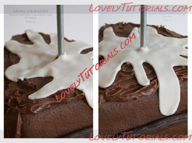 Once the handle of the cream jug has dried, remove the jug from the structure and set aside. Now, you’ll need to bake your cake. I used an 8” round 3” deep chocolate cake, but you can use any flavor you want. Once the cake has completely cooled, cut your “chunk” of cake and cut halfway through the back of the cake. Cover the metal studding with the needed amount of drinking straws and place the cake around the support. Next, make your chocolate ganache.