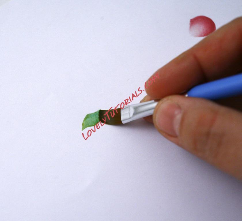 Carica tutta la setola del pennello piatto con il colore verde foglia leggermente diluito. Parti con il taglio della setola in diagonale e realizza la pennellata ad “s” muovendo il pennello ad onda.