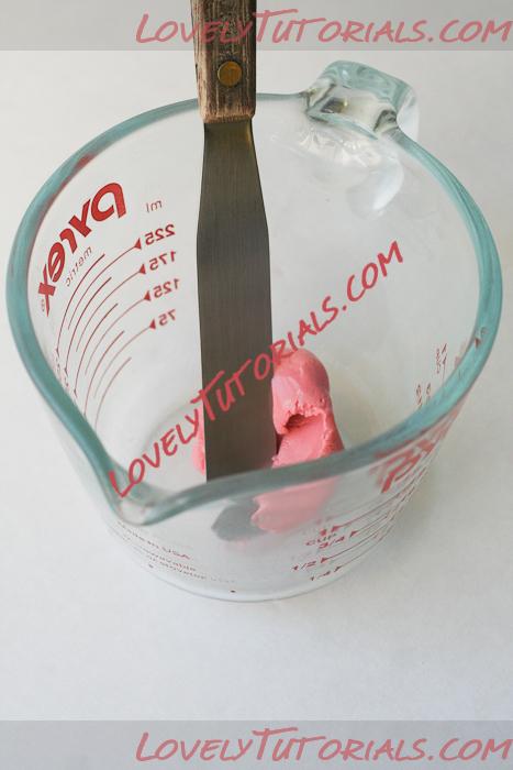 To create the gunge, put a small amount of fondant in a glass–you won’t need too much–and add a small amount of water, 1/4 teaspoon at a time.