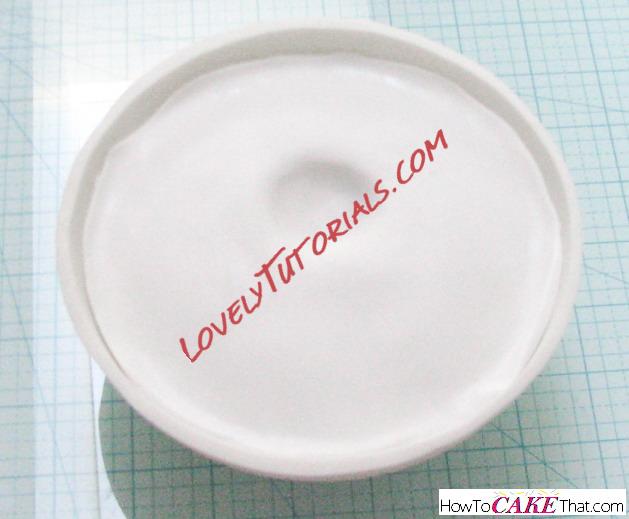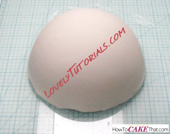 Next, knead a mixture of about 2/3 gum paste to 1/3 fondant (if you are in a humid climate, or if it's summertime, you may want to use a little more gum paste). Dust work surface generously with cornstarch and roll out fondant mixture into a round disk shape large enough to cover the ball pan half. Ensure fondant disk is thick enough to make a sturdy bowl - you don't want it thin! Drape fondant mixture over ball pan and gently shape fondant mixture over the pan using your hands. Trim off excess fondant, keeping the fondant shaped as closely to the bowl's shape as possible. Set aside to dry.