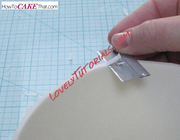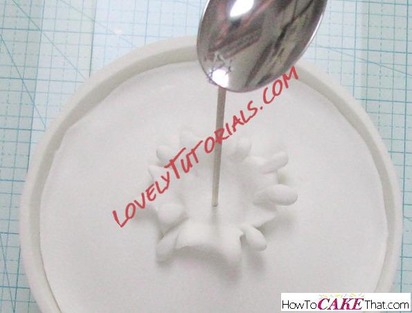 The gum paste will be too hard to push a skewer through, so we must make a hole for it. Twist the tip of an Xacto knife into the center of the gum paste to create a small hole.