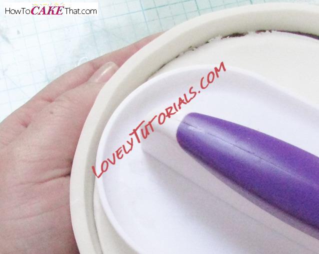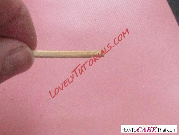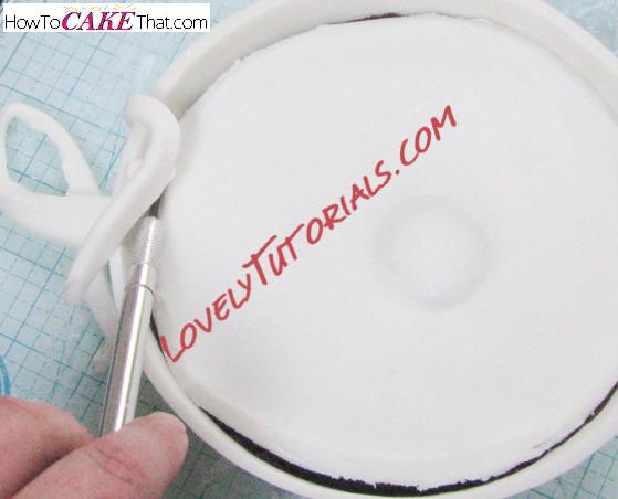 Press the end of the bamboo skewer through the hole in the gum paste and down into the cake.