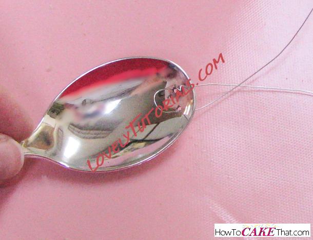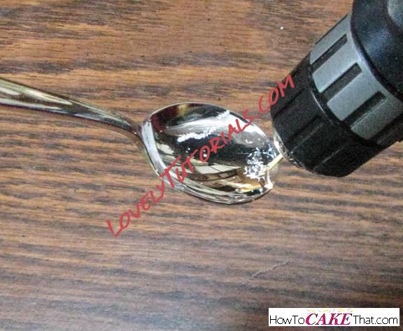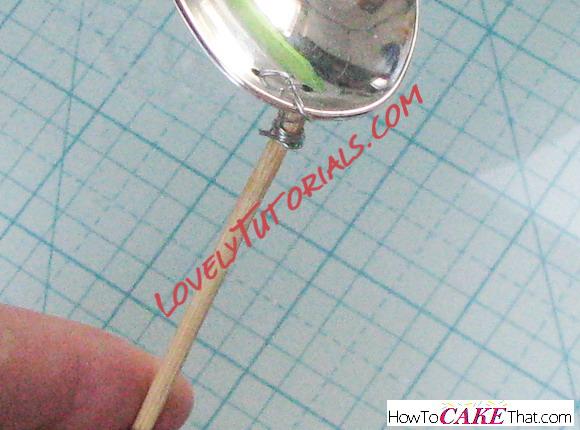 FYI: I'm totally taking the long way around this... when I posted the main photo in a facebook cake group, an awesome fellow decorator (Angie L-H) asked if I had glued the spoon to the support. Angie, you are too smart! For a quicker way to do this, hot glue the plastic spoon to the tip of the skewer instead of wiring it like I did!