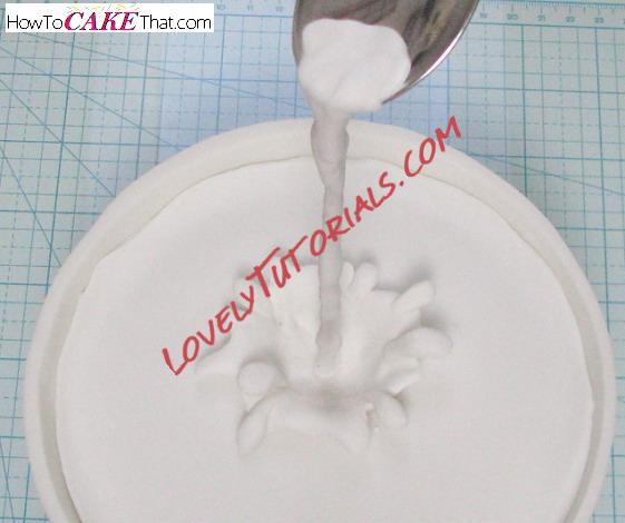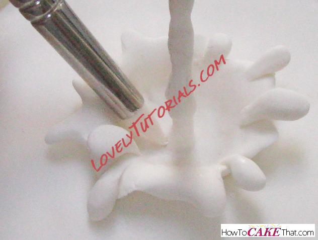 Now it's time to add the spilling milk! Using a paint brush, brush a little water into the bamboo skewer to dampen it. The water will make the fondant stick to the skewer. Add a little fondant at a time and build up around the skewer. Try to keep the spilling milk as thin as possible to keep it realistic and believable. A tiny spoon can't spill a large amount of milk - this is why a thin bamboo skewer is used instead of a thick dowel rod. Feel free to add a couple little teardrop fondant drips to the spilling milk, if desired.