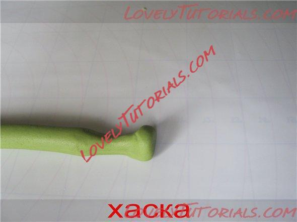 Раскатывала колбаску зеленого цвета и сажала ее на деревянный шампур. Дальше руками раскатывала ее в некоторых местах потоньше, а в другом месте делая как бы узлы потолще.